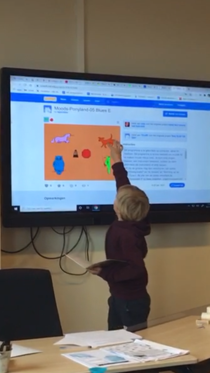 Voordat mijn leerlingen zelfstandig aan het werk gingen, heb ik mijn voorbeeldverhaal voorgedragen. Het doel van deze les was namelijk niet het verhaal zelf, maar het kunnen overbrengen van emoties in je verhaal. Daarvoor gebruikte ik het MoodsCarpet van de Conductors Band. Hierop kan je muziek in vier verschillende moods laten overvloeien met één klik op het bord. Hierdoor kan je je verhaal zelf muzikaal begeleiden. Dat maakt dat je emoties tijdens je verhaal nog beter over kan brengen, door te varieren in de muziek, je stemgebruik en je lichaamstaal.