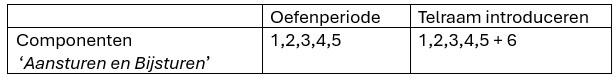 In de ‘Oefenperiode‘ gebruik je alleen de eerste vijf componenten. De ‘Oefenperiode‘ is bestemd voor docenten die nog geen ervaring hebben met ‘Aansturen en Bijsturen’.