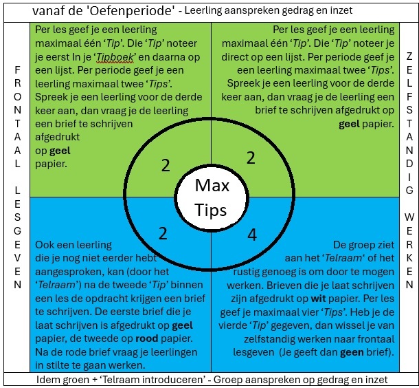 Als je een leerling binnen een les meer dan één ‘Tip‘ per les geeft, bestaat de kans dat de leerling denkt dat jij speciaal op hem of haar let. Een conflict ligt dan op de loer. Dat conflict voorkom je door vanaf de tweede les van de ‘Oefenperiode’ niet meer dan één ‘Tip‘ per leerling per les te geven en door pas in de derde les dat een leerling stoort deze leerling een brief te laten schrijven (Uitzondering: In eerste les van de ‘Oefenperiode‘ deel je wel direct een brief uit). – Door niet meer dan één ‘Tip‘ per les aan een leerling te geven per les, vermijd je conflicten. Als je geen limiet stelt aan het aantal ‘Tips‘ per les, kun je veel ‘Tips‘ geven die dan na die les vervallen en hun effect verliezen. Om dat te vermijden geef je slechts één ‘Tip‘ per leerling per les.
