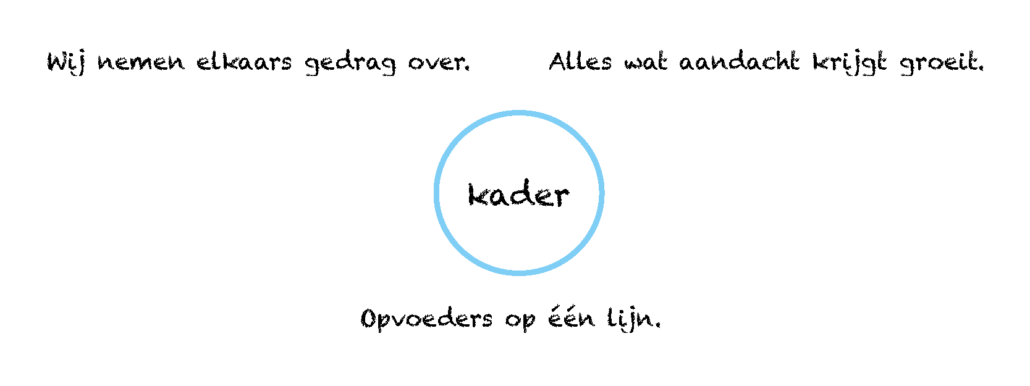 In het midden van de afbeelding staat het kader. Alles staat of valt met een kader. Bij Vriendelijk orde houden is dat Vriendelijk + Duidelijk. Je bespreekt dit kader met je leerlingen en vanaf dat moment geef je les op een vriendelijke en duidelijke manier. Dit kader werkt overal in door: