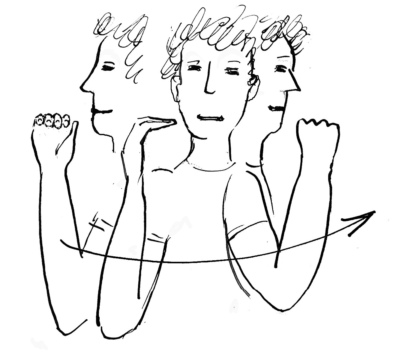 Met het draaien van je bovenlichaam maak je van het gebaar een timer. Als de draaiing is voltooid is het de bedoeling dat iedereen stil is.