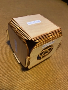 Op bezoek bij het Veerhuis in Varik kwam ik contact met Henry Mentink. Hij vertelde over de mogelijkheid om een bijeenkomst bij te wonen in het Veerhuis waarbij je een ‘bronplan’ maakt. Tijdens die bijeenkomst met drie deelnemers maakten wij onder leiding van Henry Mentink ieder ons eigen bronplan. Bij deze bijeenkomst hoorde een prachtige houten bouwplaat waarmee je een kubus maakt (zie afbeelding). Deze bouwplaat heeft zeven vlakken, De zes vlakken van een kubus + één extra zijde om de kubus te sluiten. De bouwplaat heeft een voorkant en een achterkant. Op de zijden die uiteindelijk de binnenkant vormen, plak je termen die staan voor jouw binnenwereld. Op de buitenkant plak je termen die aangeven hoe je jouw binnenwereld in contact brengt met de buitenwereld.