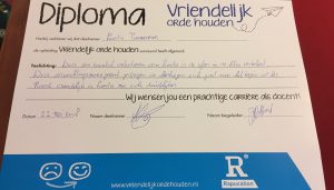 Vandaag ontving Linda haar diploma Vriendelijk Orde Houden met de volgende tekst: Door een aantal initiatieven van Linda is de sfeer in haar lessen verbeterd. Door verwachtingsmanagement gedragen de leerlingen zich goed aan het begin van de les. Naast vriendelijk is Linda nu ook duidelijker.