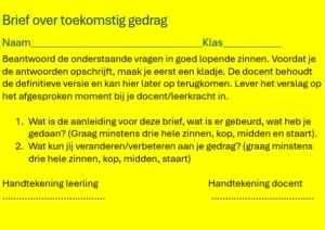 Je gebruikt het ‘Telraam‘ om de ‘Tips‘ op te tellen die je per les aan verschillende leerlingen geeft. Als het afgesproken maximum is bereikt en het nodig is om een leerling aan te spreken op gedrag of de inzet, vraag deze leerling dan om een ’Brief over toekomstig gedrag‘ te schrijven. Je maakt hierbij onderscheid tussen: